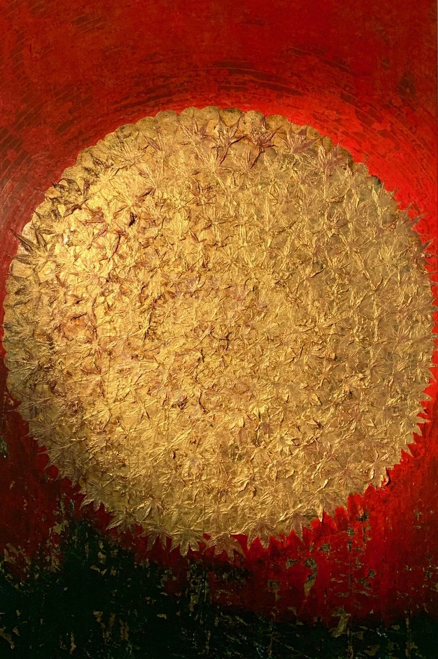 Elke bloem krijgt haar precieze plek binnen het geheel, denkend aan ikebana, Japans bloemschikken, maar dan tweedimensionaal. Alles omringd door goud, iconisch symbool voor eeuwigheid.