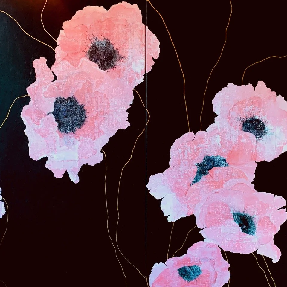 Mijn werk is beïnvloed door de Japanse filosofie. Mono No Aware, de schoonheid van het vergankelijke, verbind ik met hanakotoba, de taal van bloemen. Bloesem staat symbool voor kwetsbaarheid en liefde, papaver voor vruchtbaarheid en dood, hibiscus voor schoonheid en vergankelijkheid, Japanse esdoorn voor verandering en contemplatie, hydrangea voor dankbaarheid en respect en violen voor herinnering en trouw. Dit zijn de bloemen die ik verwerk of die ik schilder. Bloesem belichaamt voor mij de liefde voor mijn moeder, die ik als jong kind verloor, en daarmee het kwetsbare van het leven. Op het moment van haar dood bloeide de bloesem in onze tuin wonderschoon. Dit bood mij onverwachte troost. Een troost die ik met mijn werk wil doorgeven.