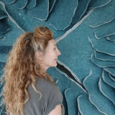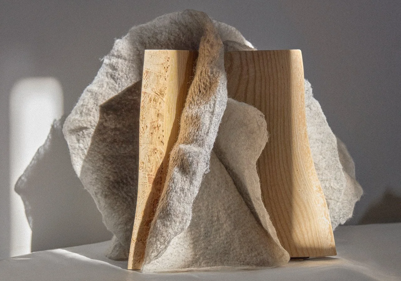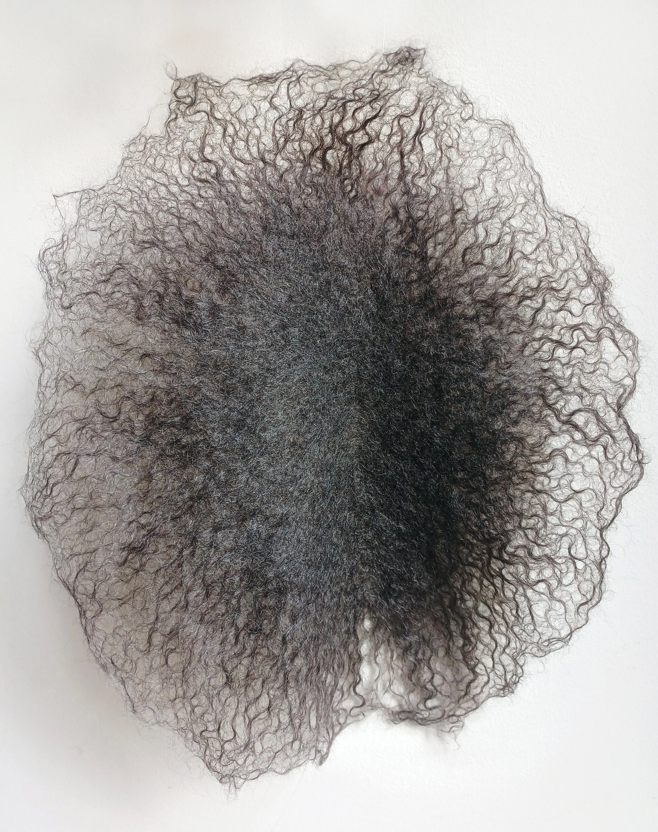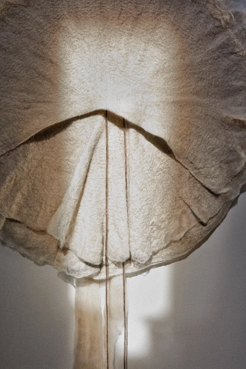 Ik houd van werken met wol, het voelen ervan en het onthullen van de fragiele schoonheid van de wol vezels door middel van vilten. Vilt, een niet-geweven textiel, ontstaat door het samenpersen van wol bevochtigd met olijfzeep en water. Toeval speelt een belangrijke rol in de uiteindelijke vorm en structuur van mijn werk, dat voortkomt uit zowel een bewust ontwerp als het willekeurig in elkaar grijpen van wol vezels. Het resultaat van dit proces kan worden gezien als een co-creatie tussen kunstenaar en gevilt wol.